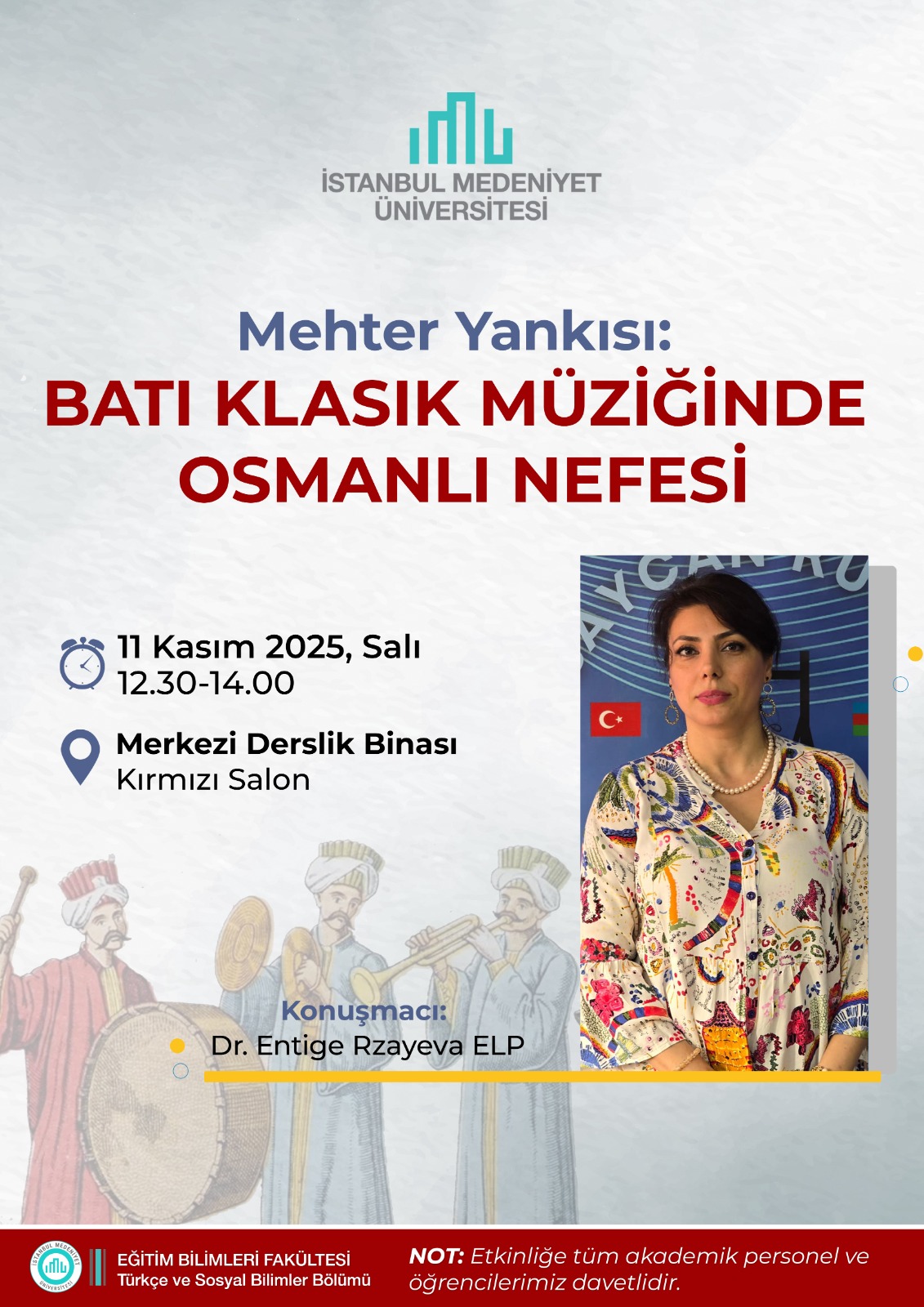 İstanbul Medeniyet Üniversitesi Eğitim Bilimleri Fakültesi Türkçe ve Sosyal Bilimler Eğitimi Bölümü tarafından düzenlenen “Mehter Yankısı: Batı Klasik Müziğinde Osmanlı Nefesi” başlıklı etkinlik, Dr. Entige Rzayeva’nın konuşmacı olarak katılımıyla 11 Kasım 2025 tarihinde, 12.30–14.00 saatleri arasında gerçekleştirilecektir.
