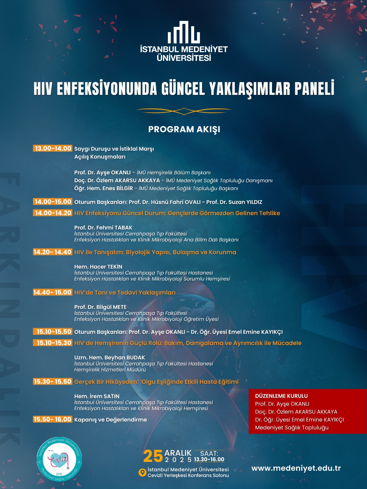 • İstanbul Medeniyet Üniversitesi Sağlık Bilimleri Fakültesi tarafından düzenlenen HIV Enfeksiyonunda Güncel Yaklaşımlar Paneli, 25 Aralık 2025 tarihinde 13.30–16.00 saatleri arasında İstanbul Medeniyet Üniversitesi Cevizli Yerleşkesi Konferans Salonu’nda gerçekleştirilecektir. Panelde HIV enfeksiyonunun güncel durumu, biyolojik yapısı, bulaşma ve korunma yolları, tanı ve tedavi yaklaşımları ile hemşirelik bakımında güncel roller ele alınacaktır. Açılış konuşmalarının ardından alanında uzman akademisyen ve sağlık profesyonellerinin sunumlarıyla program tamamlanacaktır.