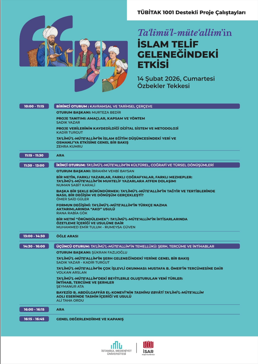 Prof. Dr. Sadık Yazar’ın İstanbul Medeniyet Üniversitesi bünyesinde yürüttüğü TÜBİTAK destekli “Eğitim Teorisi Konusunda Kanonik Bir Metin Olarak Ta‘lîmü’l-Müte‘allim’in Osmanlı Telif ve Tedris Geleneğindeki Etkisi ve Dolaşımı” başlıklı projenin ilk önemli çıktısını teşkil eden bu çalıştay, İSAR Vakfı’nın ev sahipliğinde gerçekleştirilecektir. Çalıştayda, İslam telif ve tedris geleneğinde yaygın bir dolaşıma sahip olan ve derin bir etki bırakan Ta‘lîmü’l-Müte‘allim’in telif geleneği üzerindeki yansımalarına dair elde edilen bulgular sunulacak ve söz konusu bulgular ilmî müzakereye açılacaktır.